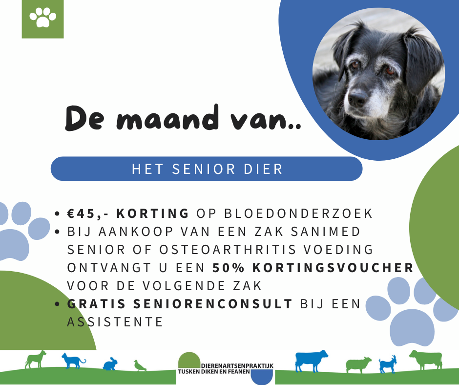 Tegenwoordig worden onze huisdieren steeds ouder. Ouderdom komt helaas niet zonder gebreken. Oudere honden en katten zijn een ster in het maskeren van ouderdomsgebreken. Maar juist bij de oudere dieren is het van belang om vroegtijdig deze problemen te signaleren, zodat uw huisdier nog langer en gezonder oud kan worden. Daarom staat bij ons de maand oktober in het teken van de senior hond en kat. U kunt deze maand profiteren van verschillende actie die passen bij uw senior dier (zie onderstaande afbeelding).