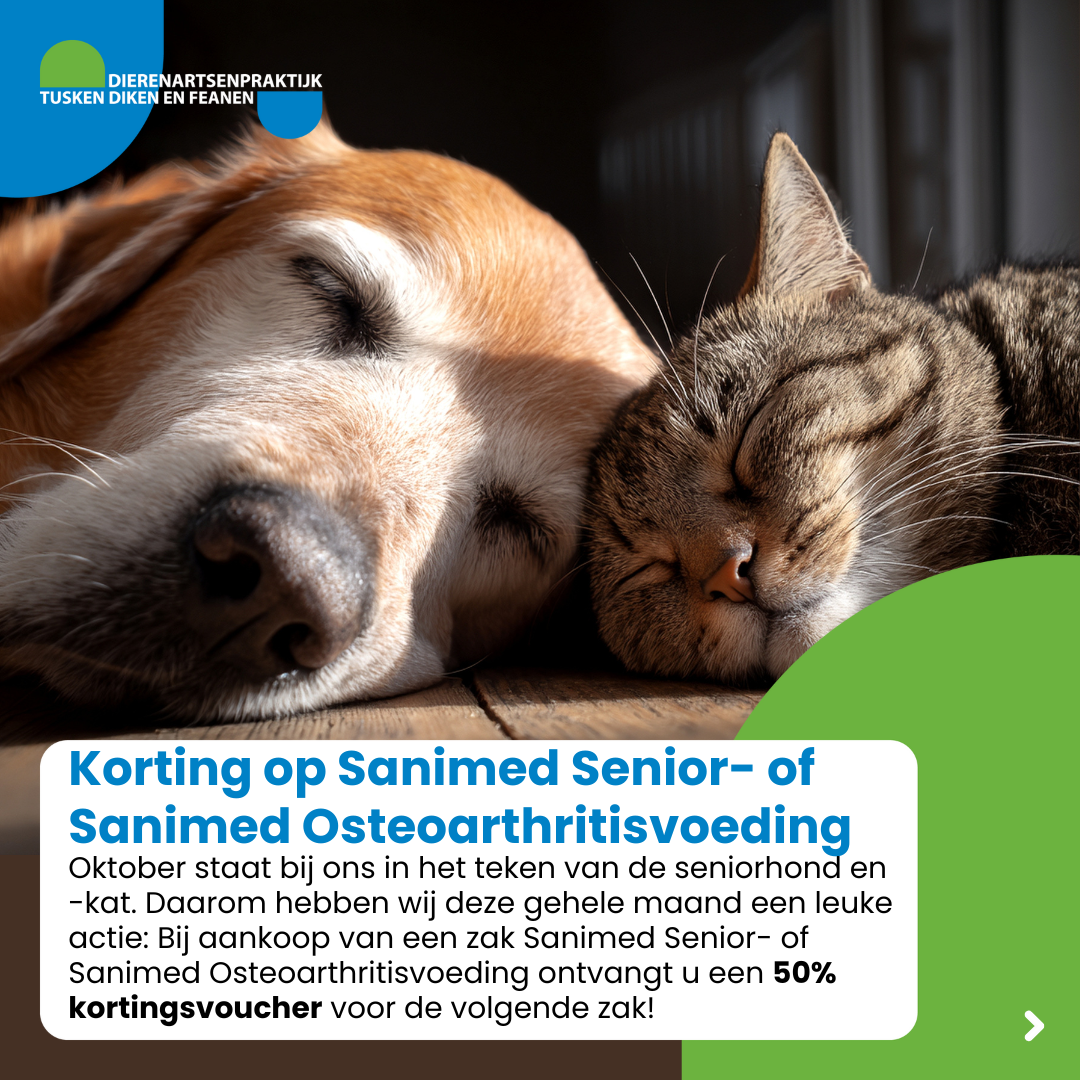 Profiteer deze maand van een leuke actie op onze Sanimed Senior of Osteoarthritis voeding: Bij aankoop van 1 zak ontvangt u een kortingsvoucher van 50% op de volgende zak Senior of Osteoarthritis voeding.